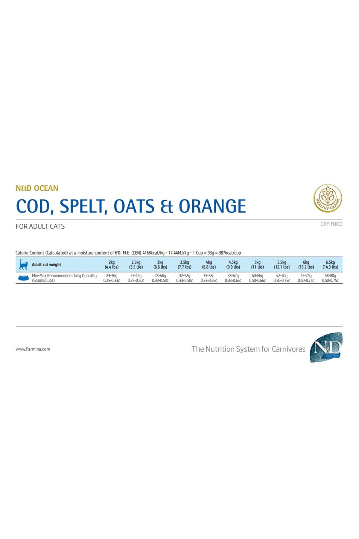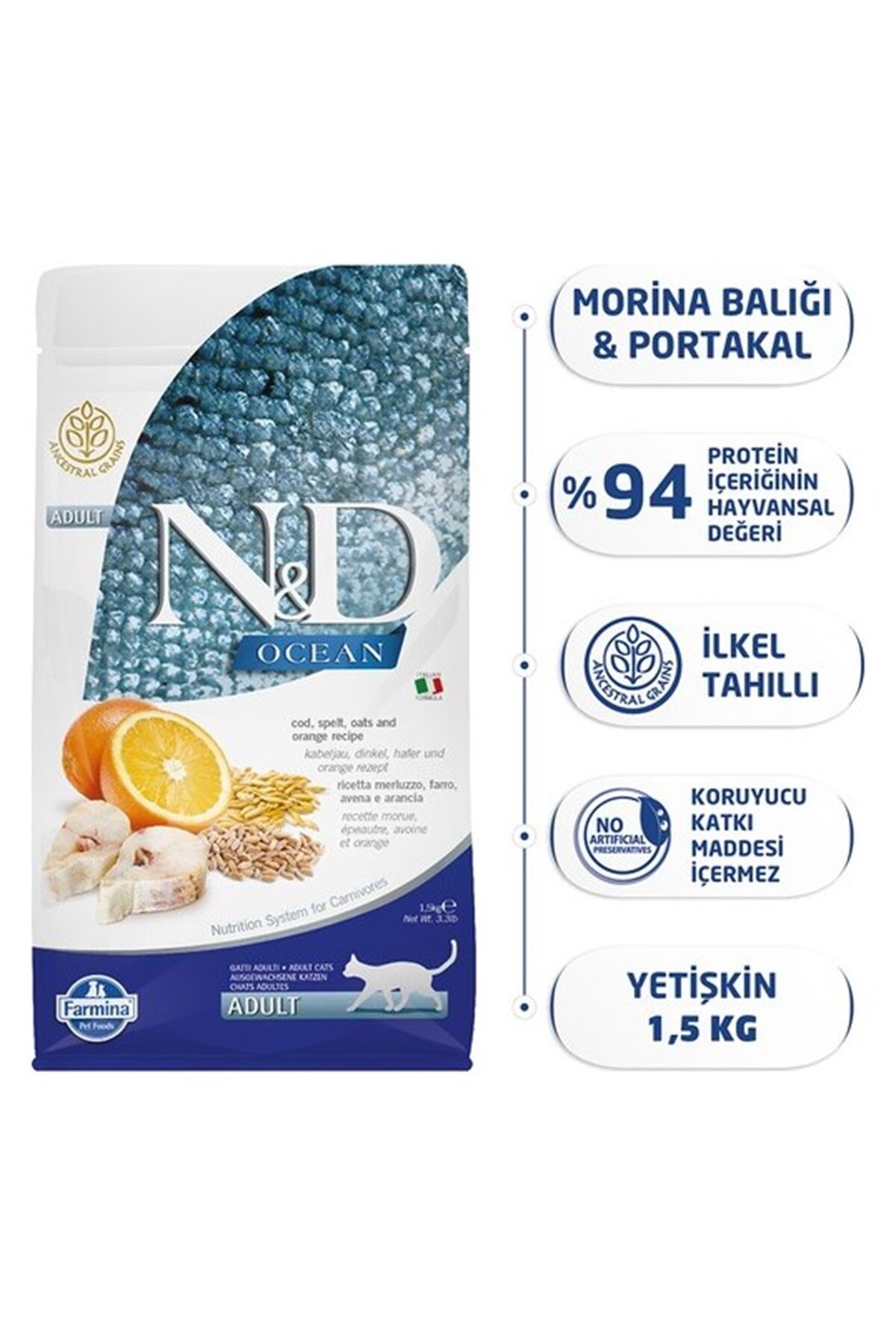 ND Ocean Düşük Tahıllı Morina Balıklı ve Portakallı Kedi Maması 1.5 kg Dostlarımız için doğadan ilham alınarak bilimsel olarak geliştirilen mamalarımız etobur beslenmesine uygundur.; Farmina ND mamaları İtalya'da üretilmekte ve üretilirken de evcil dostunuzun doğası ve damak tatları göz önünde bulundurulmaktadır.; ND mamaların üretiminde daima belli başlı altın kurallar mevcuttur.; Bu altın kurallar çerçevesinde üretilen ND mamaları en seçici kedilerin bile hayır diyemeyeceği tatta ve tazeliktedir.; Peki bu her üretimde göz önünde bulundurulan altın kurallar nelerdir ?* ND mamaların içerikleri daima kaliteli taze etten oluşmaktadır.; * Ürün içeriği yüksek protein kaynaklı ürünlerden oluşmaktadır.; * Mama içeriklerinde her zaman vitaminler, mineraller ve yüksek kaliteli taze sebze ve meyveler bulunmaktadır.; * Belirli özelliklere sahip etkili şifalı bitkiler mama formülünde yer almaktadır.; * Ürün içeriğinde minimum seviyede karbonhidrat ve tahıl bulunmaktadır.; BİLEŞİMİ :Taze morina balığı (%27), kurutulmuş morina balığı (%26), balık yağı (ringa balığı), kılçıksız buğday (%10), yulaf (%10), kurutulmuş pancar küspesi, bitkisel bezelye lifi, kurutulmuş havuç, kurutulmuş yonca, inulin, fruktooligosakkaritler, maya özü (mannan- oligosakkarit kaynağı), kurutulmuş tatlı portakal (%0.5), kurutulmuş elma, kurutulmuş nar, kurutulmuş ıspanak, fisilyum (%0.3), kurutulmuş yaban mersini, sodyum klorür, kurutulmuş bira mayası, zerdeçal kökü (%0.2), glukozamin, kondroitin sülfat.; Kg'daki İlaveler :Besinsel katkı maddeleri: A Vitamini 18000IU; D3 Vitamini 1200IU; E Vitamini 600mg; C Vitamini 300mg; Niasin 150mg; pantotenik asit 50mg;B2 Vitamini 20mg; B6 Vitamini 8.1mg; B1 Vitamini 10mg; H Vitamini 1.5mg; folik asit 1.5mg; B12 Vitamini 0.1mg; kolin klorür 2500mg;Beta-karoten 1.5mg; metiyonin hidroksilaz analoğunun çinko şelatı 910mg; metiyonin hidroksilaz analoğunun manganez şelatı 380mg;glisin hidratın demir şelatı 250mg; metiyonin hidroksilaz analoğunun bakır şelatı 88mg; DL-metiyonin 5000mg; Taurin 4000mg;L-karnitin 300mg.; Organoleptik katkılar: aloe vera özü 1000mg; yeşil çay özü 100mg; biberiye özü.; Antioksidanlar: tokoferol bakımından zengin doğal kökenli özler.; ANALİTİK BİLEŞENLER :ham protein %36.00; ham yağ %20.00; ham lif %1.90; nem %8.00; ham kül %8.00; Kalsiyum %1.20; Fosfor %1.15;Magnezyum %0.09; Omega-6 %1.80; Omega-3 %2.50; DHA %1.10; EPA %0.80; Glukozamin 1200mg/kg; Kondroitin sülfat 900mg/kg.; ENERJİ DEĞERİ :EM Kcal/Kg 4168 - Mj/Kg 17,44