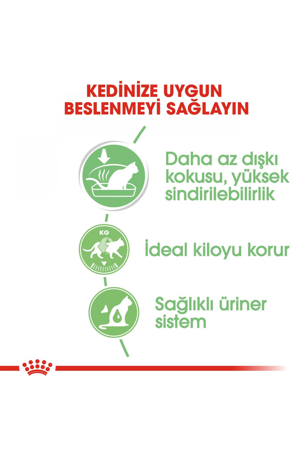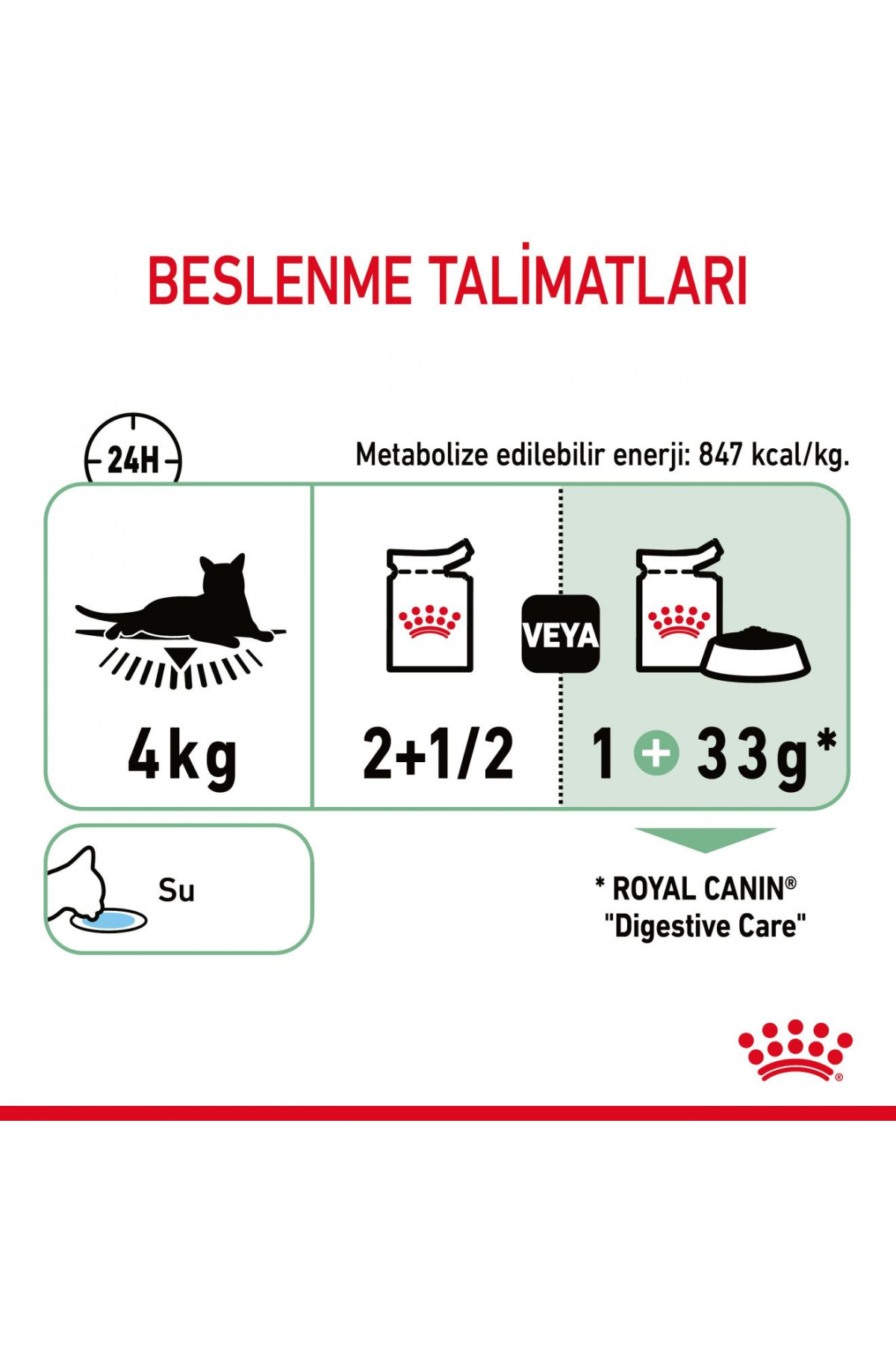 KANITLANMIŞ SONUÇLAR 10 günde %95 oranında daha iyi dışkı kalitesi Kedinizin hassas bir sindirim sistemi mi var? Hassas bir mide ve sindirim sistemi, dışkı kalitesinin bozulmasına neden olabilir ve bu da zayıf sindirimin bir işareti olabilir.; YARARLARI ROYAL CANIN® DIGESTIVE CAREDengeli bağırsak florasını desteklemeye ve optimum dışkı kalitesini artırmaya yardımcı olan tam olarak dengelenmiş beslenme formülü.; DIGESTIVE CARE PROGRAMI 1. Bu yaş mama formülünün mükemmel tamamlayıcısı olan ROYAL CANIN® DIGESTIVE CARE kuru mamasını deneyin.; 2. Kedinize insan gıdası vermekten, uygunsuz atıştırmalıklardan veya kedinizin mamasını aniden değiştirmekten kaçının.; 3. Düzenli bir beslenme programı tutmaya çalışın ve sağlıklı beslenme ve sindirimi teşvik etmek için kedinizin günlük rutininde ani değişiklikler olmadığından emin olun.; 4. Kedinizin sağlığıyla ilgili herhangi bir sorunuz veya endişeniz varsa lütfen veteriner hekiminizle iletişime geçin KOMPOZİSYON: et ve hayvansal türevler, tahılllar, mineraller, bitkisel orjinli türevler, bitkisel protein ekstratları, mayalar.; BESLENME TALİMATI: Tabloya bakınız.; Parti kodu, tescil numarası ve son kullanma tarihi için, ambalajin üzerine bakınız.; Serin ve kuru bir yerde saklayınız.; Royal Canin Turkey Evcil Hayvan Ürünleri Ticaret Limited Şirkaeti tarafından ithal edilmiştir.; İLAVELER (her kg için): Beslenmeye dayalı ilaveler: Vitamin D3 (3a671): 68 IU, Demir (3b103): 3 mg, İyot (3b202): 0.27 mg, Bakır (3b405, 3b406): 2.2 mg, Manganez(3b502, 3b503, 3b504):1 mg, Çinko (3b603, 3b605, 3b606): 10 mg, Teknolojik ilaveler: Sedimanter kökenli klinoptilolit: 2 g -
