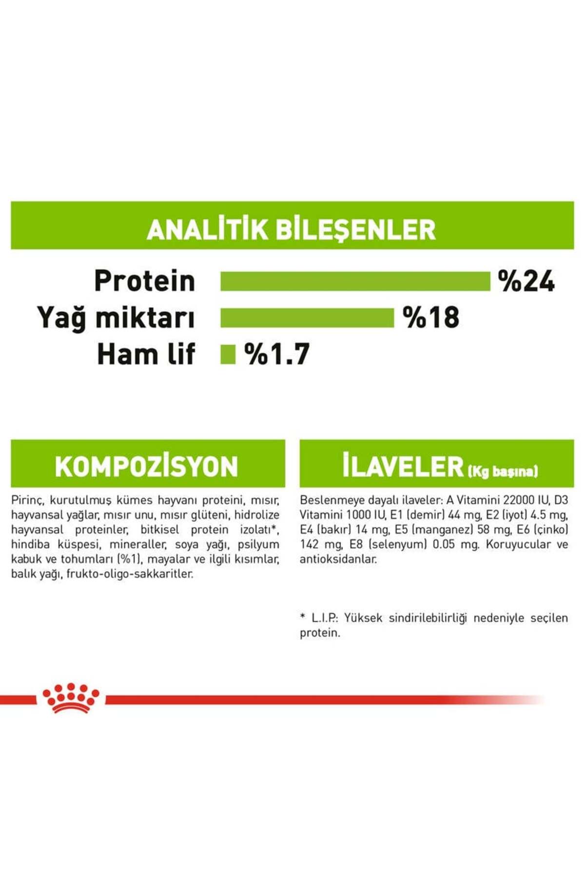 İÇİNDEKİLER : Pirinç, kurutulmuş kümes hayvanları proteinleri, mısır, hayvansal yağlar, mısır unu, mısır gluten, hidrolize hayvansal proteinler, bitkisel protein izolat*, hindiba posası, mineraller, soya yağı, balık yağı, fsilyum kabuğu ve tohumları (%1), mayalar ve ilgili parçalar, frukto-oligo-sakkaritler.; İLAVELER (her kg için): Beslenmeye dayalı ilaveler: Vitamin A: 22000 IU, Vitamin D3: 1000 IU, E1 (Demir): 44 mg, E2 (İyot): 4,5 mg, E4 (Bakır): 14 mg, E5 (Manganez): 58 mg, E6 (Çinko): 142 mg, E8 (Selenyum): 0,05 mg – Koruyucular – Antioksidanlar.; ANALİTİK BİLEŞENLERİ: Protein: %24,0 – Yağ: %18,0 – Ham kül: %5,9 – Ham lifler: %1,7 – EPA & DHA: 2,5 g/kg.